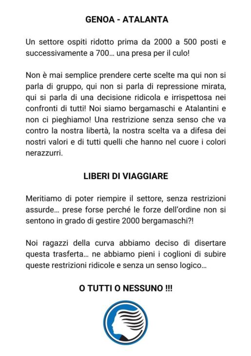 “Una presa per il c…”. “Ne abbiamo pieni i c…”. Queste solo alcune delle espressioni nel comunicato in cui la Curva Nord, il settore più caldo del tifo dell’Atalanta, annuncia e anzi conferma la propria contrarietà alla trasferta con limitazione a 700 biglietti a Marassi contro il Genoa, che vedrà così i sostenitori nerazzurri affluire in ordine sparso nel settore ospiti dell’impianto della squadra di casa del ventiquattresimo turno di campionato.