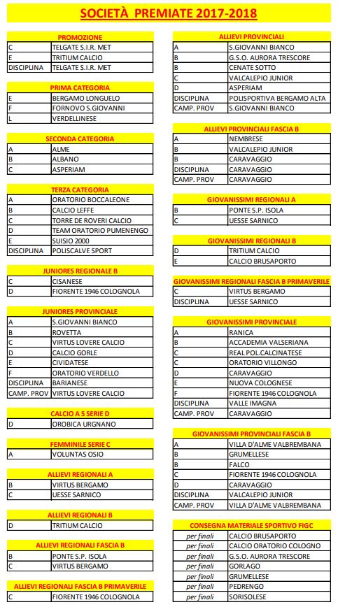 Di seguito le società premiate 2017-2018