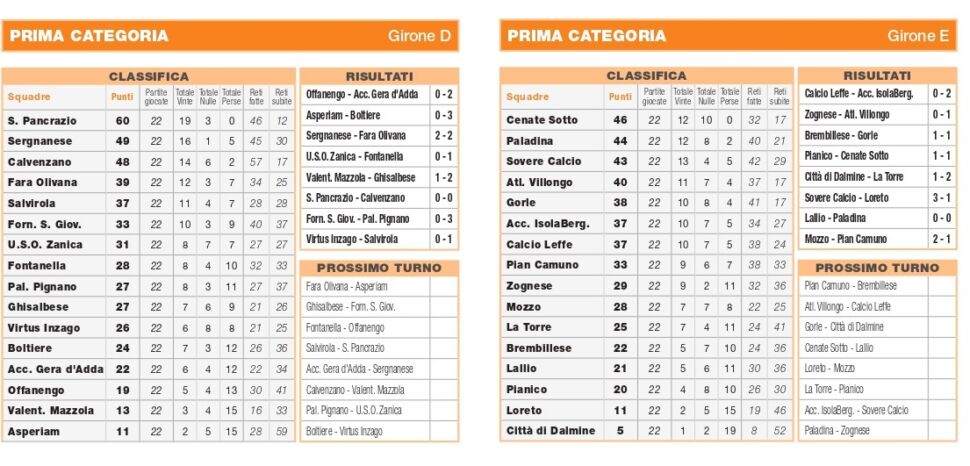 Nel girone D, la sequela di pareggi del turno scorso ha cristallizzato il quadro, San Pancrazio e Calvenzano partono favorite, contro Salvirola e Sporting Valentino Mazzola. Più complicato, almeno sulla carta, l’impegno della Sergnanese, attesa da un’Accademia Gera d’Adda che, grazie al successo di Offanengo, ha ritrovato ossigeno e sorriso. Accademia e Boltiere puntano sul fattore-campo per risucchiare altre bergamasche pericolanti, ma Ghisalbese e Fontanella godono oggettivamente di buone credenziali per ambire alla posta piena, contro Fornovo e Fontanella. Il tutto rischia di rendere vani gli sforzi, comunque tangibili, dell’Asperiam, oggi più che mai a un passo dal baratro: agli uomini di Meroni servirà un’impresa per battere una Fara Olivana con Sola votata ai playoff. Alle prese con un girone di ritorno che non rende giustizia a quanto di buono fatto vedere lungo l’andata, l’Uso Zanica reca visita al Palazzo Pignano, con la prospettiva di offrire un favore alle “cugine” più inguaiate.