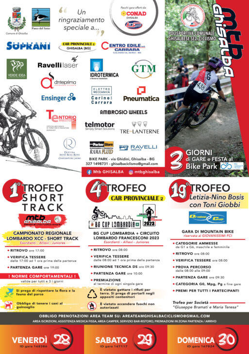Tre giorni di sport, divertimento e di mountain bike. Tutto è pronto, in casa dell’ Mtb Ghisalba, per ospitare la tre giorni off road, con l’accogliente Bike Park che ospiterà, dal venerdì 28 a domenica 30 luglio, gare di grande fascino e spettacolarità, per quanto concerne l’attività dei Giovanissimi e quella Agonistica Giovanile. Ogni atleta, ogni accompagnatore, ed il pubblico, troverà una splendida accoglienza, e soprattutto, ogni tipo di esigenza ed appoggio da parte della società ghisalbese, per quanto concerne l’aspetto agonistico, la sicurezza, lo spazio per i team e per coloro che arriveranno con i camper, ed anche l’aspetto culinario con un ottimo servizio bar-ristoro. Si parte venerdì con il campionato Regionale Lombardo Short Track prova riservata agli Esordienti (13/14 anni), Allievi (15/16 anni), e Junior (17/18 anni). Il sabato spazio alla prova del circuito del Bg Cup Lombardia e del Trofeo Lombardia, sempre per Esordienti, Allievi e Junior, giornata valida per il 4^ trofeo Car Provinciale 2. Domenica 30, infine, saranno i Giovanissimi (7/12 anni) a regalarci una splendida giornata di sport, divertimento ed aggregazione, con il programma che propone la prova del circuito Orobie Cup nonché 19^ ed Trofei Letizia-Nino Bolis con Toni Giobbi. In palio, per la prima società, il trofeo Giuseppe Bramati e Maria Teresa. Un grande lavoro da parte dell’ Mtb Ghisalba, ma società determinata a portare avanti uno splendido messaggio sportivo per quanto concerne la mtb giovanile. Questo grazie ai volontari, a tutto lo staff dell’Mtb Ghisalba, genitori, amministrazione comunale, ed ovviamente i nostri sponsor. In allegato la locandina, utile per prendere visione del programma gare, trovando anche indicazioni importanti per quanto concerne iscrizioni, prenotazioni, e contatti con la società organizzatrice.