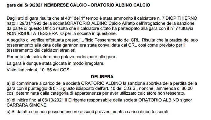 Nembrese-Oratorio Albino, cambia il risultato: è 3-0 a tavolino 10 Settembre, 2021 Di seguito l’estratto del comunicato riguardante il match di domenica tra Nembrese e Oratorio Albino: