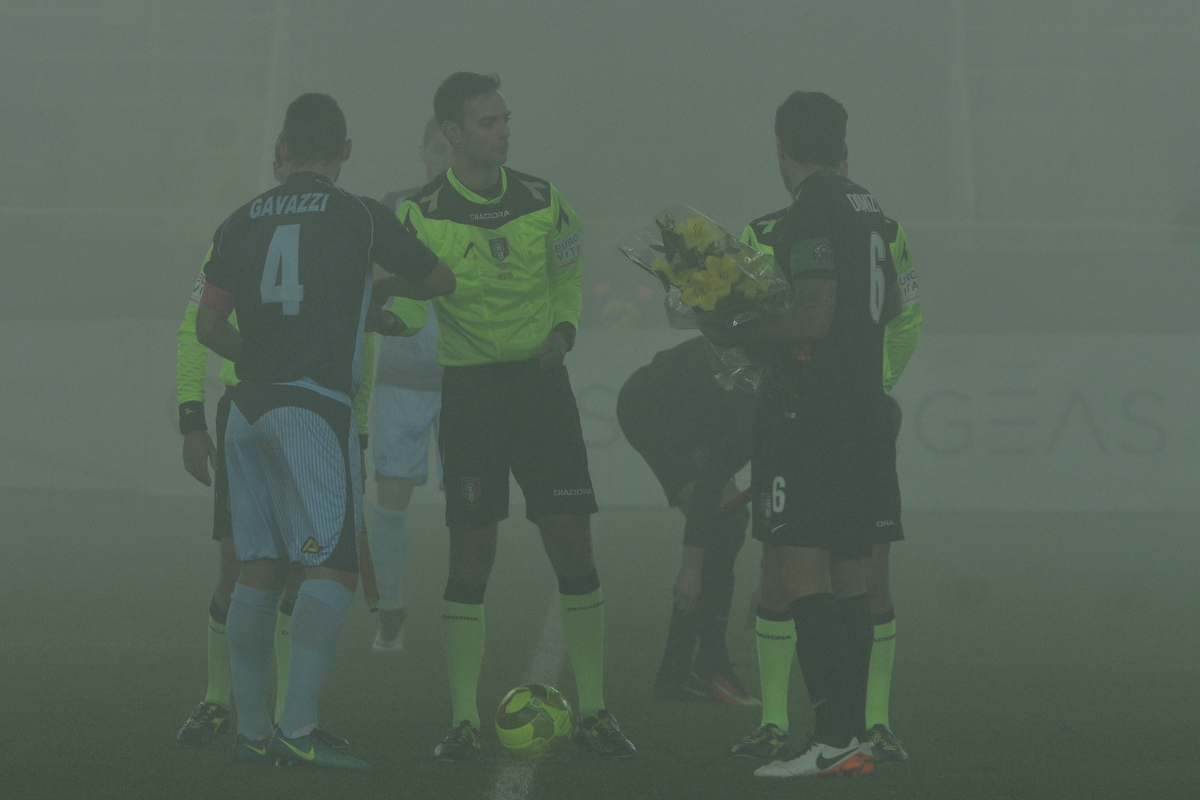 I seriani tengono bene il campo anche contro i lagunari di Superpippo Inzaghi, un mezzo ex (fu al Leffe della covata di Mutti coi vari Furlanetto, Cefis e Maffioletti: ’92/’93, tutti all’Hellas la stagione successiva) insieme a quelli veri di turno, il prestito Virdis e due panchinari, il match winner e Malomo. In avvio dal nebbione mostruoso spuntano il conato individuale di Agnello, che al 3′ cicca la mira dal vertice destro, e la svettata di Geijo che al 6′ non ci prende sul traversone di Marsura. I bergamaschi si affidano alle incursioni degli interni, con Giorgione a svariare a destra ottenendo un angolo, e della solita freccia Gonzi. Al 12′ l’attaccante sardo col 21 sulle spalle è in offside (traversa) sullo scavetto di Giorgione, mentre in mezzo si destreggia benino Di Ceglie, che nel sostituire Loviso (acciaccato come i vari Coser, Cortellini e Riccardo Moreo, mentre Anastasio è squalificato) compone per la seconda volta (dopo il 2-0 al Lumezzane) la coppia di Lallio con capitan Gavazzi. Verso il quarto d’ora la foschia si dirada (match iniziato alle 18.47 per ritardo del pullman degli arancioneroverdi) in tempo per alzare il sipario al ventesimo sul cross di Giorgione, autore del consueto taglio in diagonale, smanacciato da Facchin.