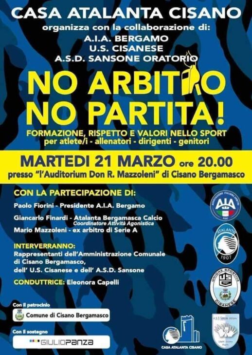 L’appuntamento è fissato per martedì 21 marzo alle 20 presso l’Auditorium Don Mazzoleni di Cisano. Parteciperanno Paolo Fiorini (presidente AIA Bergamo), Giancarlo Finardi (coordinatore dell’attività agonistica dell’Atalanta), l’ex arbitro di Serie A Mario Mazzoleni, il delegato di Bergamo Nicola Radici e il direttore di Bergamo & Sport Matteo Bonfanti. Sono previsti anche interventi dei rappresentanti dell’amministrazione comunale di Cisano, della Cisanese e dell’ASD Sansone.
