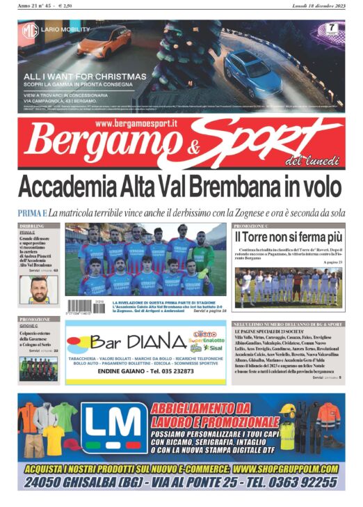 Numero extralarge di Bergamo & Sport, che, come sempre, potete acquistare o dal vostro giornalaio di fiducia o tramite la nostra edicola digitale cliccando dalle sei di mattina su www.bergamoesport.it/abbonamenti. Ventitre pagine speciali tutte da leggere dove Villa Valle, Virtus, Caravaggio, Casazza, Falco Albino, Trevigliese AlbinoGandino, Valcalepio, Cividatese, Comun Nuovo, Lallio, Acos Treviglio, Gandinese, Aurora Terno, Revolutional Carvico, Accademia Calcio, Acov Verdello, Rovetta, Nuova Valcavallina, Albano, Ghisalba, Mariano e Accademia Gera d’Adda fanno il bilancio del loro 2023 e augurano un felice Natale e buone feste a tutti i calciatori della nostra provincia. Titolo d’apertura della nostra copertina dedicato alle imprese dell’Accademia Calcio Alta Val Brembana, assoluta rivelazione di questo primo scorcio di stagione nel girone E di Prima. Nell’ultimo turno la matricola terribile ha vinto il derby brembano contro la Zognese ed ora è seconda in classifica da sola dietro alla capolista Pianico. Sempre in tema Accademia Calcio Alta Val Brembana, la puntata odierna di “Dribbling” con il nostro Paolo Arrigoni che racconta la carriera di Andrea Pianetti, super portalettere e straordinario difensore proprio della squadra di San Giovanni Bianco. In prima pagina anche due formazioni del girone C di Promozione: il Torre de’ Roveri, che continua il suo momento d’oro superando la Fiorente Bergamo, e la Gavarnese, che firma l’impresa di giornata andando a vincere a Cologno al Serio. Ultimo numero dell’anno 2023 di Bergamo & Sport ricco di partite seguite dai nostri giornalisti, oltre sessanta tra quelle di Serie C, dei dilettanti e dell’Over 40, e di approfondimenti, tra cui spicca un lungo articolo del nostro direttore, Matteo Bonfanti, sulla conquista del campionato europeo di rally da parte di Maurizio Grigis, fenomenale pilota, che è il figlio di Paolo, il tuttofare della Falco Albino. Che altro? Il solito consiglio: non importa dove, non importa quando, ma comperate Bergamo & Sport.