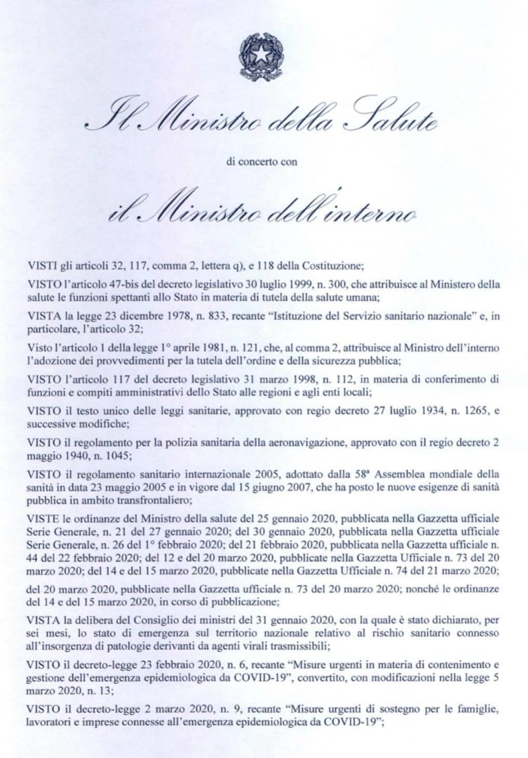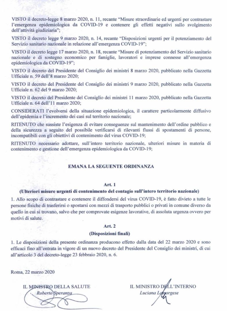 Vietato spostarsi, con mezzi pubblici o privati, dal Comune in cui ci si trova. Questo l’oggetto della nuova ordinanza sul Coronavirus del Ministero della Salute e di quello dell’Interno, firmato “di concerto” dai titolari Roberto Speranza e Luciano Lamorgese ed entrato in vigore oggi, domenica 22 marzo, fino a nuovo decreto del Presidente del Consiglio dei Ministri. Ovviamente non mancano deroghe ed eccezioni a questa nuova disposizione di divieto, che si accavalla alle precedenti: “[…] salvo che per comprovate esigenze lavorative, di assoluta urgenza ovvero per motivi di salute”.