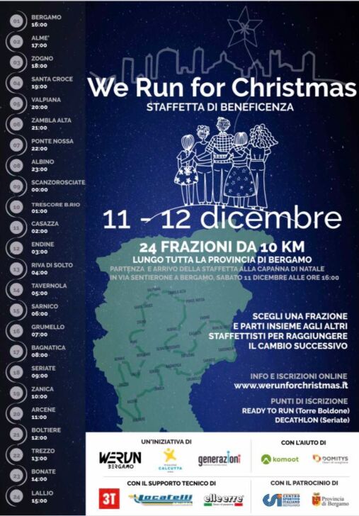 Torna questo weekend la staffetta natalizia di beneficenza “We Run for Christmas”, organizzata dall’associazione promotrice degli allenamenti di gruppo “We Run Bergamo”. Alle ore 16 di sabato 11 dicembre i primi partecipanti si lasceranno alle spalle la Capanna di Natale sul Sentierone, iconico punto di partenza e arrivo dell’intera manifestazione, per portarne lo spirito natalizio su tutto il territorio provinciale. Ogni 10 km un corridore-tedoforo, dopo avere coperto in circa un’ora la distanza della propria frazione accompagnato dai partecipanti suoi accompagnatori, passerà il testimone al rappresentante del segmento successivo. Questa operazione si ripeterà per ben 24 ore in altrettante differenti località e si concluderà di nuovo a Bergamo sul Sentierone, da tabella di marcia 24 ore dopo la partenza: alle 16 di domenica 12 dicembre. Ancora una volta il movente è benefico: dopo anni di fruttuosa collaborazione con il Patronato San Vincenzo, tanto a sostegno dell’attività sul territorio che di quella in terra boliviana, quest’anno a beneficiare dei fondi raccolti sarà la Cooperativa Sociale Generazioni FA per il suo progetto di “tirocini sportivi” realizzati in collaborazione con Missione Calcutta ONLUS. Si tratta, nello specifico, di percorsi volti a incrementare il lavoro educativo nei confronti di ragazzi spesso in condizioni di grave fragilità con esperienze sportive che possano rappresentare uno stimolo e una possibilità di riscatto. Un progetto molto affine ai valori che ispirano da anni l’attività di We Run Bergamo e per questo considerato dagli organizzatori particolarmente coerente con la propria identità. Per iscriversi e per maggiori informazioni, è online il sito www.werunforchristmas.it e attiva la mail info@werunbergamo.it.