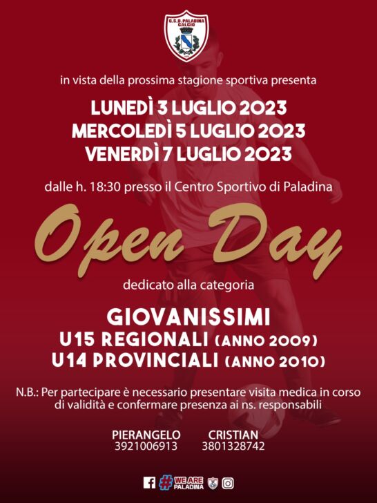 Lunedì 3 luglio, mercoledì 5 luglio e venerdì 7 luglio, il Paladina Calcio vi invita all’Open Day dei ragazzi di due categorie: Giovanissimi U15 regionali (2009) e Giovanissimi U14 provinciali (2010). Il tutto si terrà al centro sportivo di Paladina alle ore 18:30. Per partecipare è necessario presentare una visita medica in corso di validità. Tutte le info nella locandina: