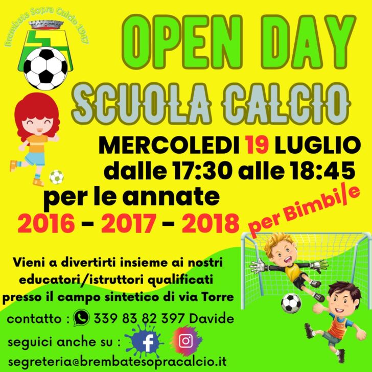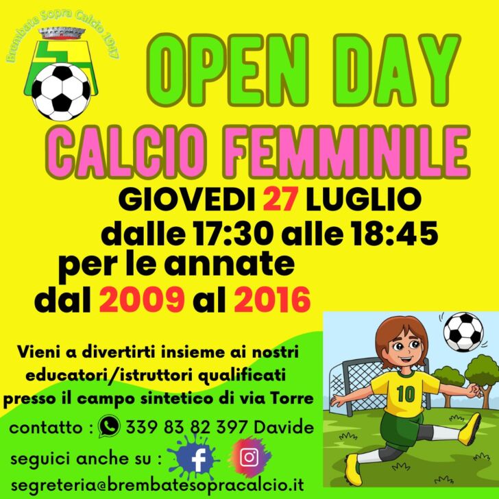 Il Brembate Sopra comunica due open day nel mese di luglio. Il primo, il 19 luglio, sarà dedicato alla scuola calcio, annate 2016-2017-2018, l’iscrizione è aperta per bimbi e bimbe di queste annate, dalle 17:30 alle 18:45. Il secondo incontro invece dedicato interamente al calcio femminile è in programma giovedì 27 luglio, sempre dalle 17:30 alle 18:45, per le annate dal 2009 al 2016. Per tutti i contatti e le ulteriori informazioni vi lasciamo le locandine qui sotto: