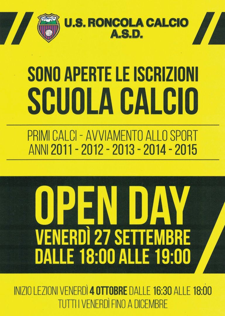 Open day venerdì 27 dalle 18 alle 19 alla Roncola per le iscrizioni alla Scuola Calcio e primi calci (anni 2011-12-13-14-15). Sarà possibile parlare con i responsabili della Scuola Calcio Sandro Bonacina e Giuseppe Viscardi.