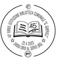 Completano l’immagine le scritte “10° Anniversario Elevazione a Titolo di Città” e “45° Anniversario Istituzione Biblioteca Comunale “G. Gabrieli” – 22/4/2023 – 24050 Orio Al Serio”.