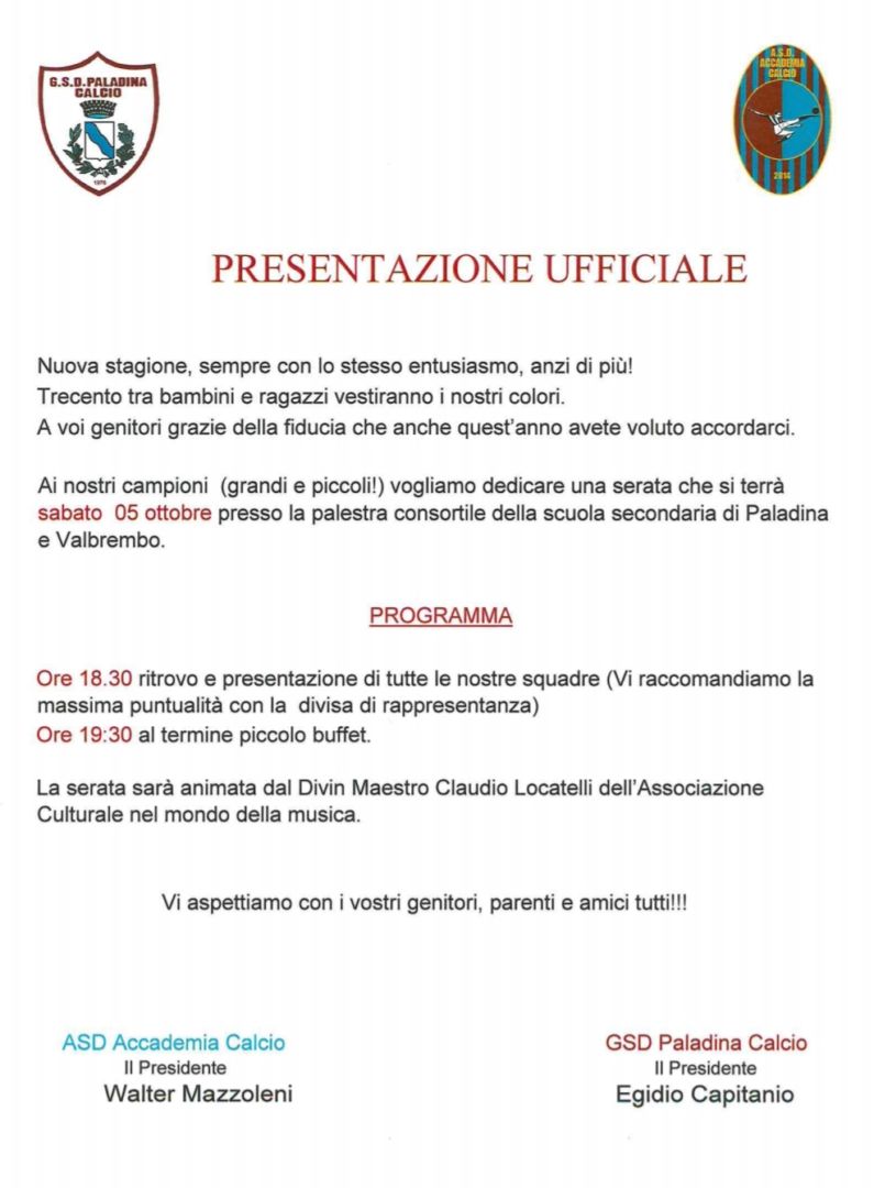 Ecco l’invito rivolto dai due presidenti Walter Mazzoleni (Accademia Calcio) ed Egidio Capitanio (Paladina) a tutti i loro tesserati, famiglie, collaboratori e simpatizzanti. Ne parleremo lunedì sul Bergamo&Sport in edicola.