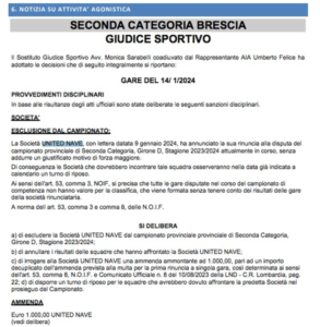 Di seguito il comunicato che rende noto il ritiro dello United Nave dal campionato di Seconda categoria (girone D) con relativa ammenda. Di conseguenza domenica 14 gennaio l’Oratorio Palosco osserverà un turno di riposo.