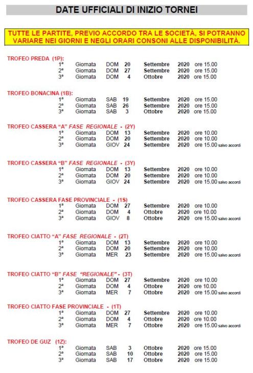 Preda, Bonacina, Cassera, Ciatto e De Guz: ecco le date 4 Settembre, 2020 Sono state comunicate le date di inizio dei tornei di Bergamo: Preda, Bonacina, Cassera, Ciatto e De Guz. Di seguito pubblichiamo il quadro completo.