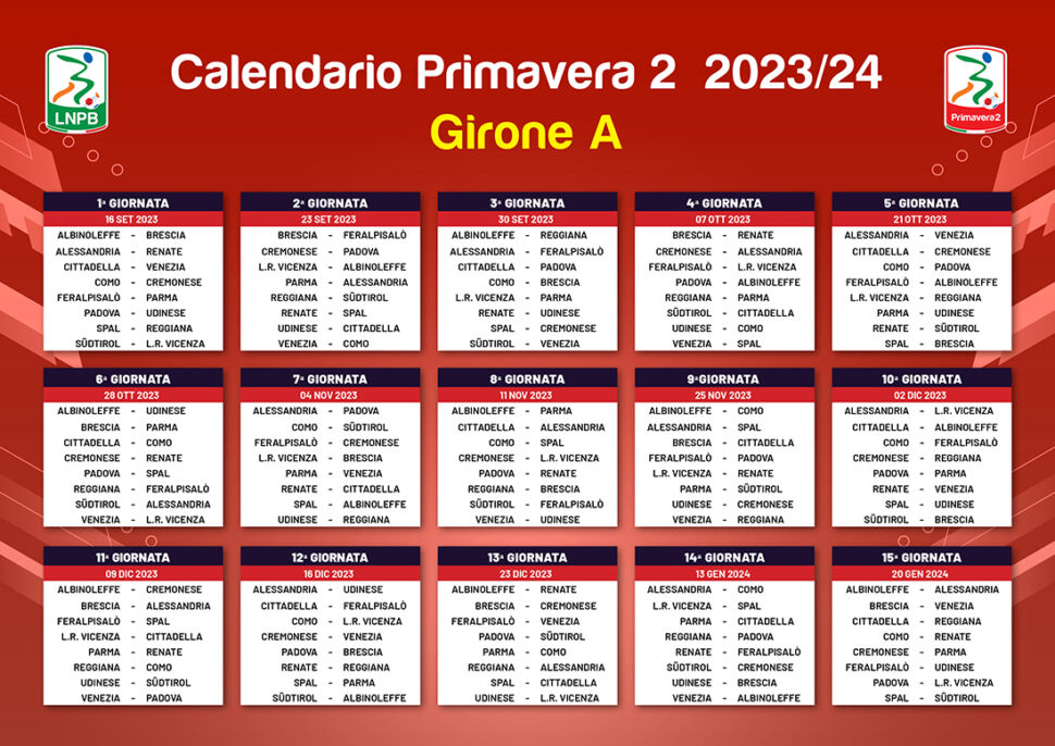 Ricomincia dalla classicissima Serio contro Oglio la vicenda dell’Under 19 dell’AlbinoLeffe nel campionato Primavera 2. La Lega Nazionale Professionisti Serie B ha roso nota la composizione dei gironi e il Calendario Primavera 2 per la Stagione Sportiva 2023/2024.