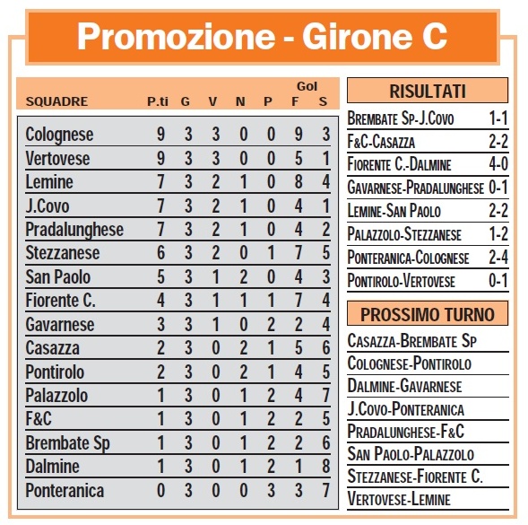 Ponteranica-Colognese 2-4: 12’pt Terzi (P), 24’pt Khalil (C), 43’pt Borali (C), 10’st Giordano (C), 14’st Sana (C), 35’st Messedaglia (P)