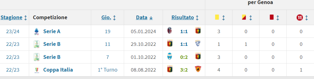 2 vittorie e altrettanti pari (vedi screenshot da Transfermarkt) per la squadra di Alberto Gilardino, che ultimamente ci ha pareggiato a Bologna il 5 gennaio (20′ Gudmundsson, 95′ De Silvestri) facendosi raggiungere al fotofinish; quota 1 in tutte e tre le voci per i nerazzurri, che non incrociano il fischietto designato per la ventiquattresima dall’11 marzo dell’anno scorso, una secca sconfitta al “Maradona” col Napoli firmata Kvaratskhelia (60′) e di testa Rrahmani (77′). La serie nerazzurra con Colombo aveva avuto solo due precedenti, nello stesso campionato l’11 settembre 2022 a Bergamo con la Cremonese, 1-1 (Demiral al 74′ di testa su punizione di Koopmeiners, 78′ Valeri su tiro di Ascacibar respinto maldestramente da Musso) e nel 5-2 sempre interno allo Spezia nell’ottavo di Coppa Italia il 19 gennaio precedente (10′ e 12′ Lookman, 14′ Ekdal, 26′ Hateboer, 38′ Verde, 72′ Hojlund, 90′ autogol di Ampadu su tiro di Hojlund finito sul palo).
