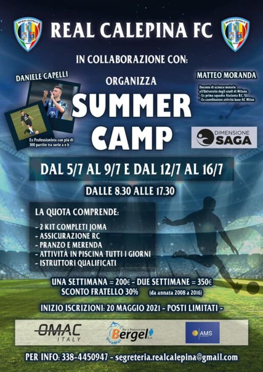 La società Real Calepina organizza il Summer Camp estivo riservato ai giovani calciatori nati tra il 2008 e il 2016. Il Camp potrà vantare la collaborazione di Daniele Capelli, ex difensore dell’Atalanta e attualmente in forza proprio alla Real Calepina, e di Matteo Moranda, docente di scienze motorie nonché ex coordinatore dell’attività di base al Milan.