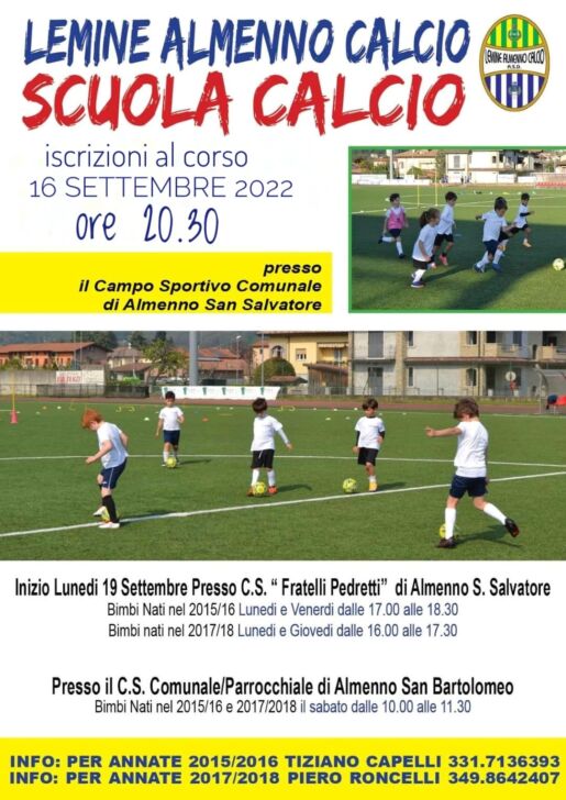 Riparte la Scuola Calcio targata Lemine Almenno. Le iscrizioni al corso si terranno il 16 settembre 2022 alle 20.30 presso il campo sportivo comunale di Almenno San Salvatore.