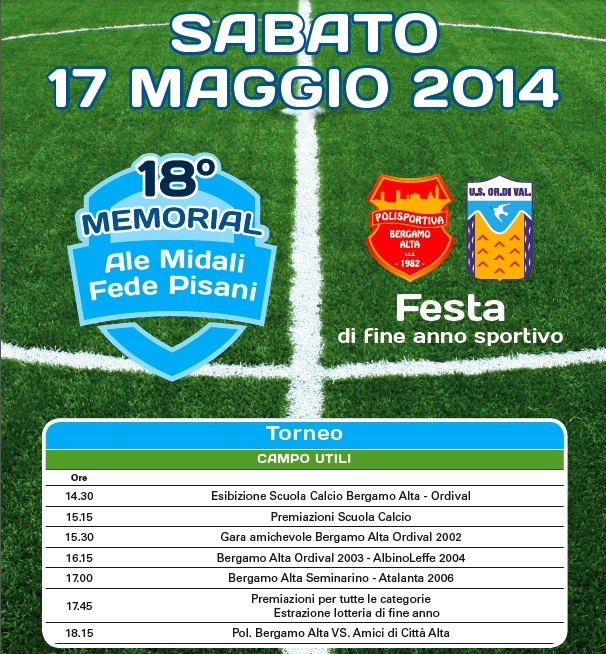 Bergamo – Sabato 17 maggio a partire dalle ore 14,30 presso il campo “Generale Utili” di via Baioni, si terrà il 18° Memorial “Ale Midali e Fede Pisani”.