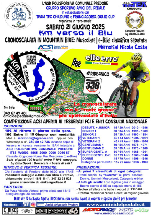 PREDORE (BG) – Sabato 21 giugno torna l’attesa cronoscalata “Km Verso il Blu”, giunta alla 18ª edizione, organizzata dall’A.S.D. Polisportiva Comunale Predore – gruppo Amici del Pedale – in collaborazione con il Team TEX Chiuduno e Franciacorta Oglio Cup.