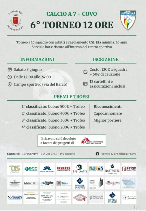 Sabato 3 giugno il “6° Torneo 12 ore di Covo” 12 Maggio, 2023 Di seguito la locandina dell’evento con tutte le informazioni a riguardo: