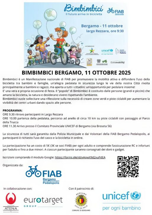 Le strade di Bergamo si trasformano in un grande spazio di gioco, ascolto e libertà di movimento per i nostri bambini e ragazzi. Bimbimbici 2025, evento promosso da FIAB – Pedalopolis con la collaborazione dell’Associazione Atena, torna infatti sabato 11 ottobre per offrire un’occasione unica di vivere il piacere della bicicletta come strumento di benessere, socialità e cittadinanza attiva, in concomitanza con l’arrivo del Giro di Lombardia 2025, a significare l’importanza della bici per la nostra città.