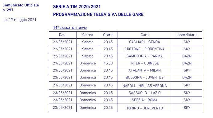 L’Atalanta è stata messa in calendario domenica sera nell’ospitata al Milan che deciderà le posizioni e anche l’ultima qualificata alla prossima edizione della Champions League. Ovviamente in contemporanea con Napoli-Hellas Verona e Bologna-Juventus, le altre partite dell’ultima giornata di serie A cointeressate alla corsa per l’Europa. Il fischio d’inizio dei match del 23 maggio è fissato per le 20.45. Anche Torino-Benevento, teoricamente barrage per la salvezza coi sanniti di Pippo Inzaghi obbligati ai 3 punti, così come del resto i rossoneri a Bergamo per restare al riparo da brutte sorprese (Atalanta 78 punti, Napoli e Milan 76, Juventus 75), è programmata per lo stesso orario, nonostante il recupero dei granata di domani sera in casa della Lazio (20.30) valido per la sesta di ritorno. Inutili ai fini della classifica, invece, i tre anticipi del sabato; l’Inter campione d’Italia gioca domenica ma al pomeriggio.