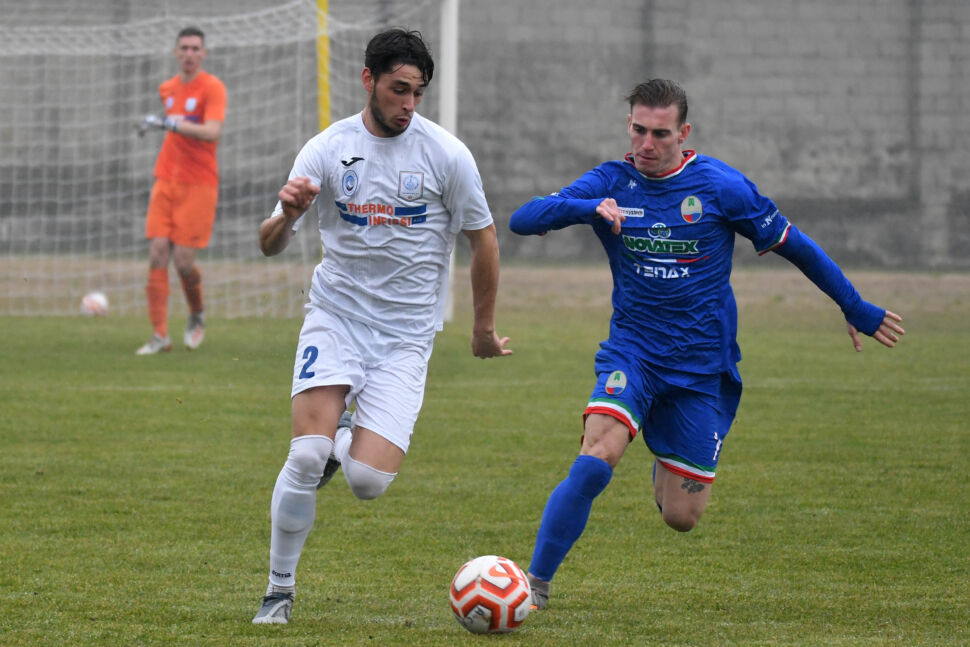 Pronti via al Matteo Legler e il primo lampo è dei padroni di casa, griffato dalla girata in area di Capelli – su sponda di Ferreira Pinto – bloccata a terra da Guarino. Lo stesso numero 1 ospite si ripete al 10’, bloccando in presa la torsione aerea di Ibe. La prima grande occasione da gol, però, arriva due minuti dopo, sul fronte opposto: scarico in area a beneficio di Tremolada che si gira e, da posizione ideale, calcia incredibilmente sopra la traversa. Segue una fase di totale transizione tra due squadre che si danno battaglia nella zona nevralgica del campo pur senza impressionare dal punto di vista del ritmo e dell’intensità. Al 25’ sussulto NibionnOggiono a movimentare lo spartito: Tremolada converge al limite dell’area e calcia con il sinistro, Pagno c’è. Prima della mezz’ora, Curioni è già costretto al primo cambio, inserendo Rota al posto dell’acciaccato Manzoni. Stessa sorte tocca al tecnico Commisso, poco dopo, chiamato alla sostituzione forzata di Barzotti, rilevato da Citterio. All’imbocco del segmento finale del primo tempo, il NibionnOggiono prova ad alzare i decibel di una sfida piuttosto bloccata: Fall si arrampica su un cross dalla sinistra ma impatta senza inquadrare il bersaglio. Dal canto suo il Ponte opera benissimo in fase difensiva e di fatto corre zero rischi. Al 35’ i Blues si affacciano in area ospite: cross dalla destra e spizzata aerea di Capelli che manda alto sopra la traversa. A sei dal break, la formazione lacustre cestina un’altra monumentale palla gol: Fall sfonda dalla destra e propizia il tentativo di Tremolada, respinto da Pagno, sulla ribattuta arriva Fognini che da un metro, e a porta totalmente sguarnita, calcia sopra la traversa. Graziato il Ponte.