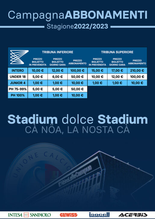 Praticamente nelle ultime tre stagioni, dopo la scadenza del contratto di affitto/utilizzo dello stadio di Bergamo, gli appassionati blucelesti hanno potuto assistere alla gesta dei loro beniamini sul fronte interno soltanto dieci volte, visto l’esilio al “Città di Gorgonzola”. Tariffe molto semplificate per invogliare a tesserarsi: 100 euro per l’intera annata in Tribuna Inferiore – settore parzialmente scoperto, a stretto contatto con il terreno di gioco -, e 210 per la Tribuna Superiore coperta, mentre i ticket di Tribuna Vip verranno riservati esclusivamente a soci, sponsor, dirigenza ospite e autorità come specifica il comunicato ufficiale del club.