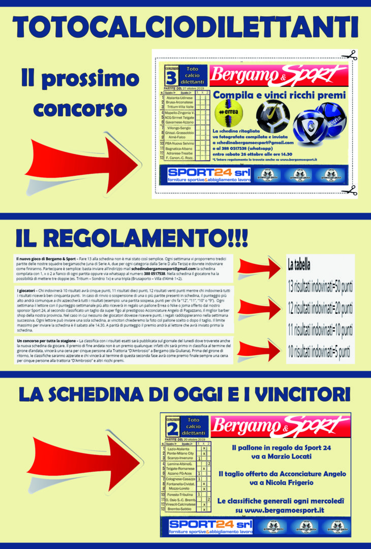 Aumentano i partecipanti così come aumentano in vincitori del Totocalciodilettanti. Nella seconda schedina ci sono stati due campioni, in grado di indovinare 10 risultati su 13. Si tratta di Marzio Locati (vincitore del pallone offerto da Sport 24, primo premio in palio) e di Nicola Frigerio (aggiudicatosi il taglio di capelli ad Angelo Acconciature, il barbiere dei vip). Di seguito la classifica generale e i risultati della seconda giornata: