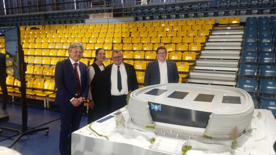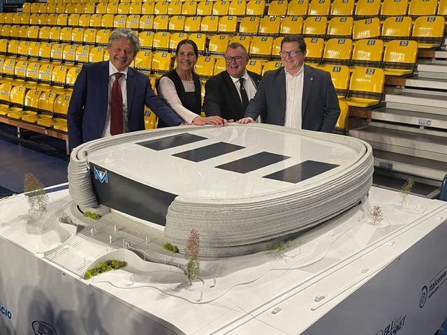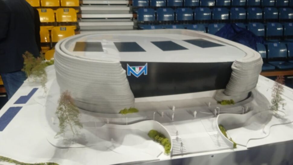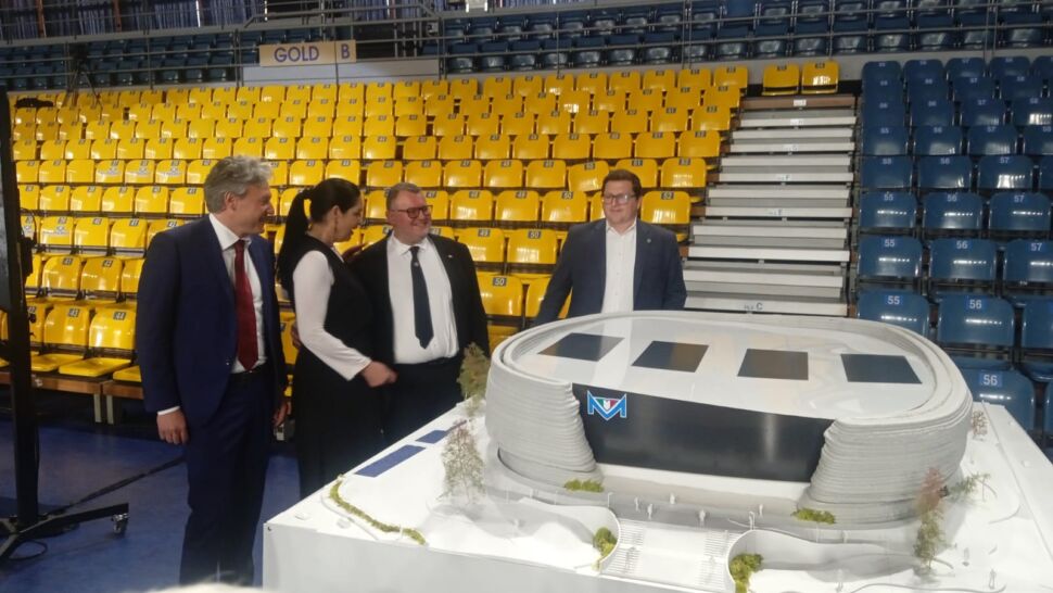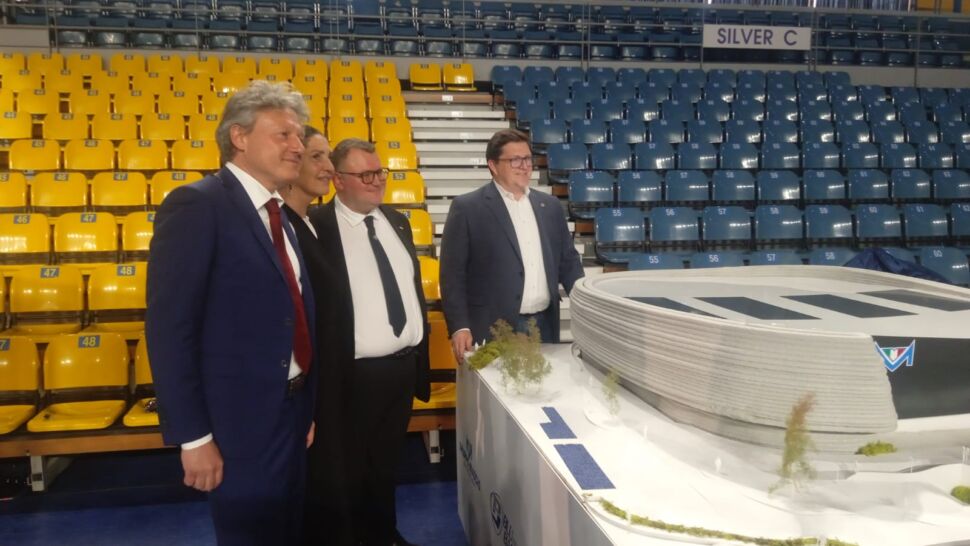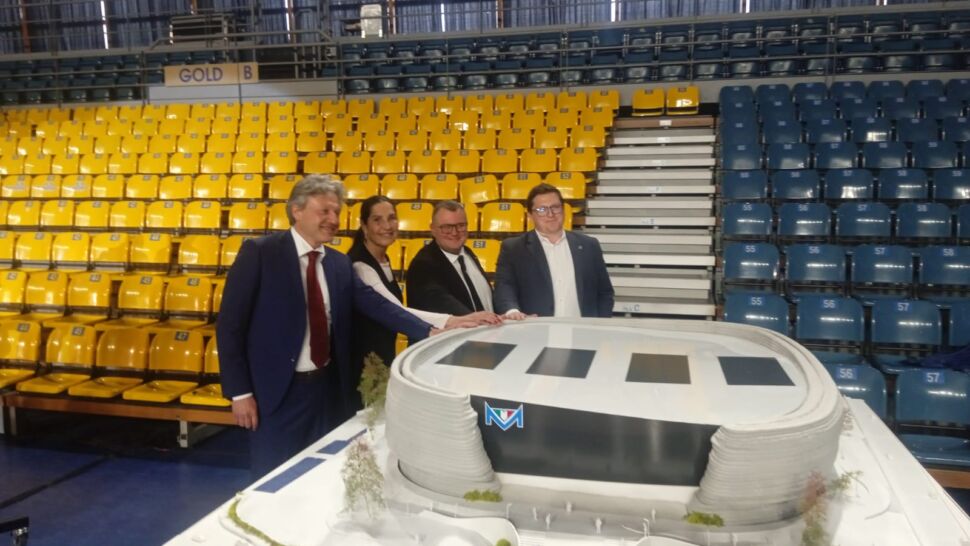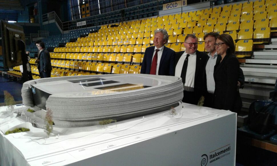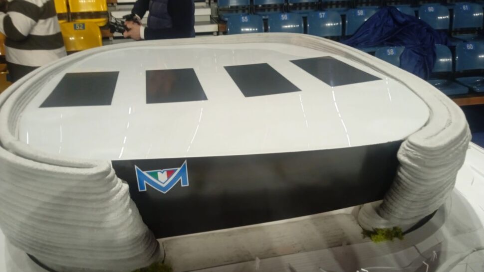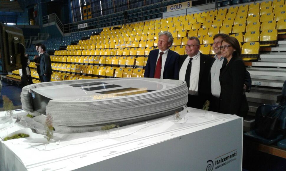 Per adesso c’è soltanto il modellino, e guai a chiamarlo plastico. Una colata di calcestruzzo realizzata da un braccio meccanico, 2 metri per due con elementi in tecnologia FDM (fused deposit modeling) in PLA (acido polilattico, bioplastica fatta di mais, tapioca o canna da zucchero), 450 chilogrammi di peso, svelato nella vecchia arena esistente ormai da quasi un trentennio. “Una realizzazione in 3D printing con brevetto italiano, un modellino in scala 1:60. Il primo esempio del genere risale al Design Week di Milano nel 2018 – sottolinea Deborah Floris, Head of Tech Assistance del partner Italcementi -. La stessa tecnologia in atto per una grande struttura ad Heidelberg. A realizzarla, la startup ETESIAS presso l’Università Federico II di Napoli: cemento, sabbia e additivi specifici mixati da braccio robotico con la caratteristica dell’autoportanza, quindi la struttura non collassa”.