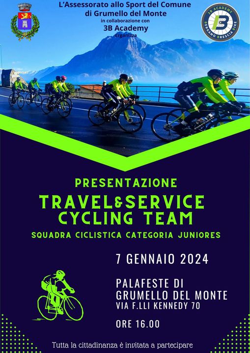 Travel & Service Cycling Team, il 7 gennaio la presentazione a Grumello del Monte 7 Gennaio, 2024 Oggi alle ore 16 presentazione della squadra ciclistica categoria Juniores Travel&Service Cycling Team (presso il Palafeste di Grumello del Monte)