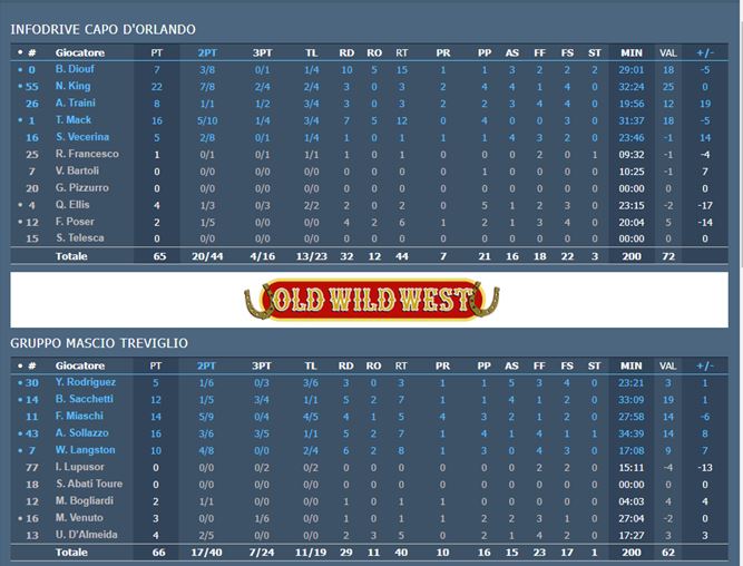Vittoria del collettivo, con un Langston subito estromesso dalla partita a seguito dei falli, ma che ha visto un positivo Sollazzo, ormai una certezza in questa squadra, un Sacchetti da 19 di valutazione mentre dalla panchina non è arrivato il solito apporto. Non sono bastati agli orlandini i 38 punti della coppia Usa. Siciliani che pagano anche le 21 palle perse ed i 10 tiri liberi falliti. Per Treviglio finalmente un nuovo squillo in trasferta.