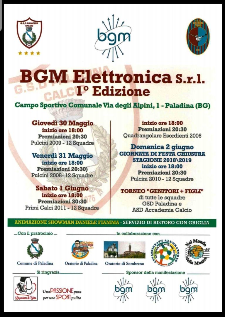 Trofeo BGM elettronica: è la prima edizione, si gioca a Paladina dal 30 maggio al 2 giugno, ogni sera una categoria diversa: 2009 (12 squadre il 30 maggio), 2008 (12 squadre il 31 maggio), 2011 e quadrangolare Esordienti 2006 sabato 1 giugno, domenica 2 giugno i 2010 e un torneo genitori-bambini durante tutta la giornata.