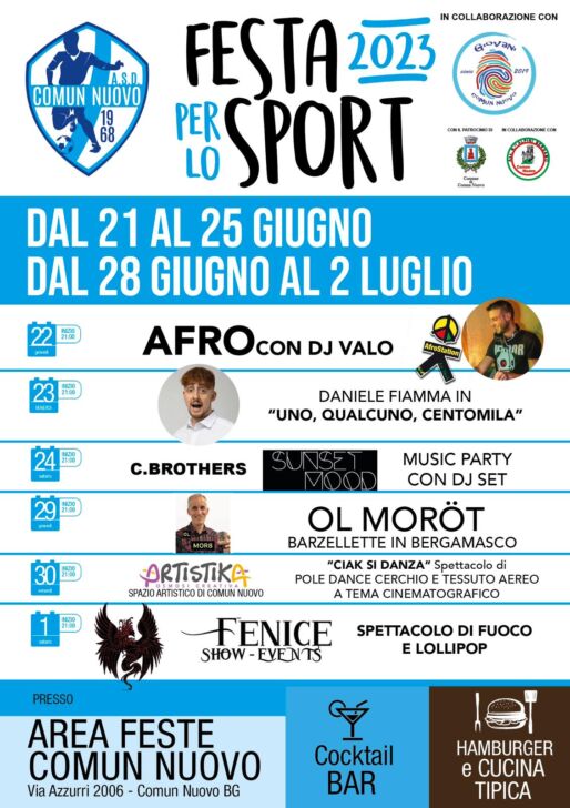 In seguito alla promozione in prima categoria, il Comun Nuovo ha deciso di dare continuità ai festeggiamenti organizzando la “festa per lo sport”, un evento speciale in cui sarà possibile “abbuffarsi” e assistere a numerosi spettacoli. La festa si svolgerà dal 21 al 25 Giugno e dal 28 al 2 Luglio presso l’area feste di Comun Nuovo.