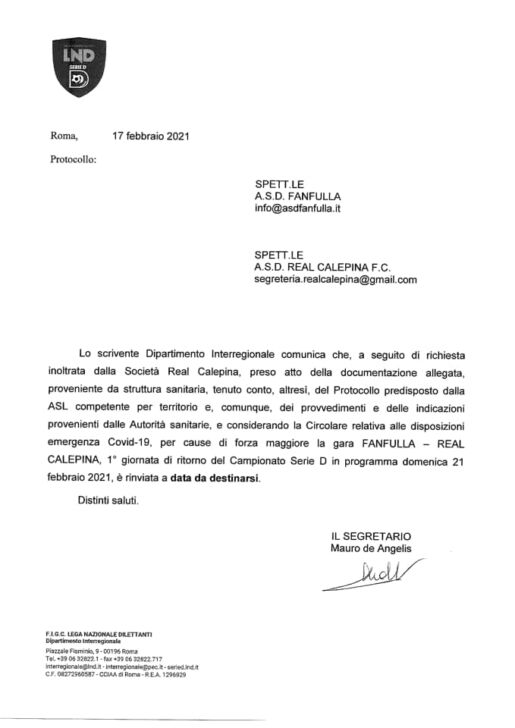 Adesso è ufficiale: la gara valida per la prima di ritorno del campionato di Serie D tra Fanfulla e Real Calepina è stata rinviata causa Covid. Di seguito vi alleghiamo il comunicato della Federazione: