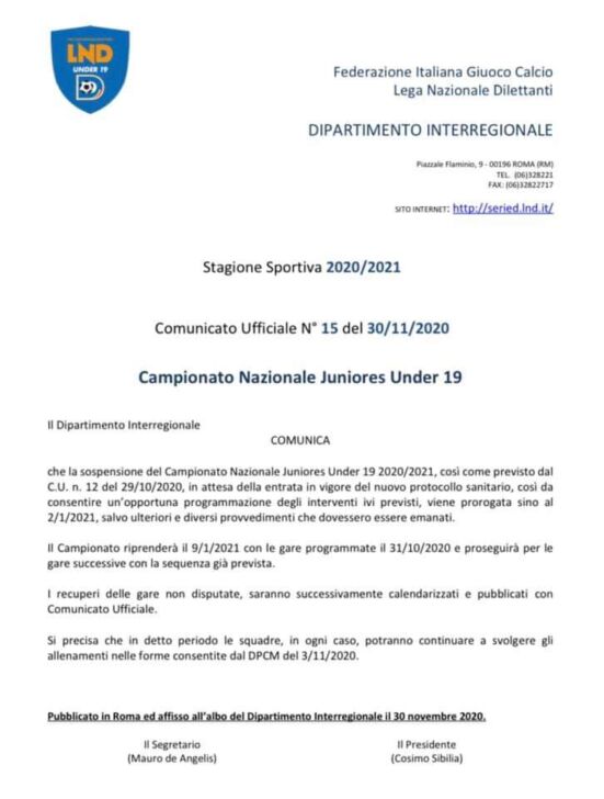 Il Campionato Nazionale Juniores ripartirà soltanto nel 2021. La Lega Nazionale Dilettanti ha diramato un comunicato ufficiale nel quale si specifica che, in attesa dell’approvazione del nuovo protocollo sanitario, la sospensione del campionato Under 19 viene prorogata sino al 2 gennaio 2021.