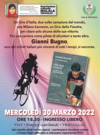 Treviglio – L’Associazione Malala organizza per mercoledì 30 marzo 2022 presso il Tnt un incontro con il bi-campione del mondo di ciclismo Gianni Bugno.