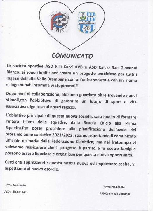 Un progetto nuovo di calcio per l’alta Val Brembana che coinvolge San Giovanni e Fratelli Calvi 19 Aprile, 2021 Fratelli Calvi e San Giovanni uniscono le forze per un progetto nuovo di calcio in alta Val Brembana. Ecco il comunicato: