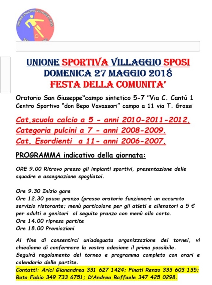 Unione Sportiva Villaggio Sposi al servizio del territorio. Il 27 maggio il “Torneo della Comunità”
