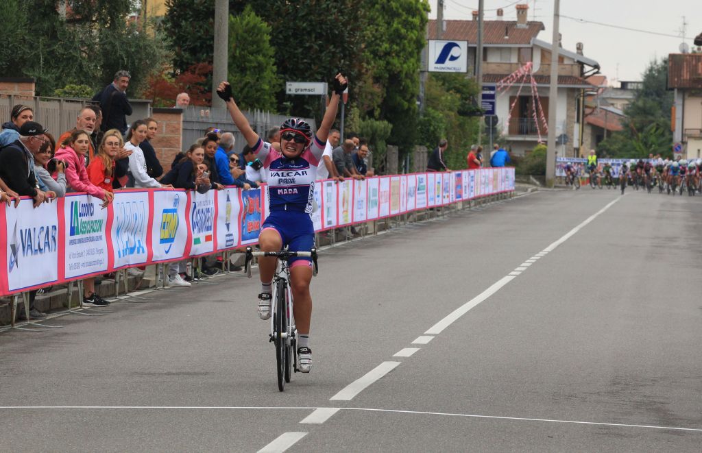 Francesca Pellegrini (Valcar-PBM). Tra le tre non c’è accordo ed è la bergamasca di Capizzone a far saltare il banco e ad attaccare in solitaria. Questa è l’azione decisiva. Sul traguardo Francesca Pellegrini si presenta solitaria e può esultare a braccia alzate con 44 secondi di vantaggio sul gruppo regolato in volata da Giulia Raimondi, seconda, e dall’altra portacolori della Valcar nonché campionessa italiana corsa a punti Stella Greco.