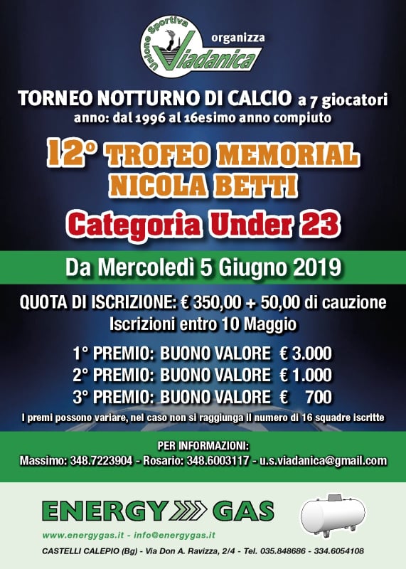 L’Unione Sportiva Viadanica organizza il 12° Memorial Nicola Betti, categoria Under 23. Il torneo notturno di calcio a 7 comincerà mercoledì 5 giugno 2019. Quota di iscrizione di 350 euro + 50 euro di cauzione, iscrizioni entro il 10 maggio. Per informazioni contattare Massimo (348.7223904), Rosario (348.6003117) o la mail u.s.viadanica@gmail.com