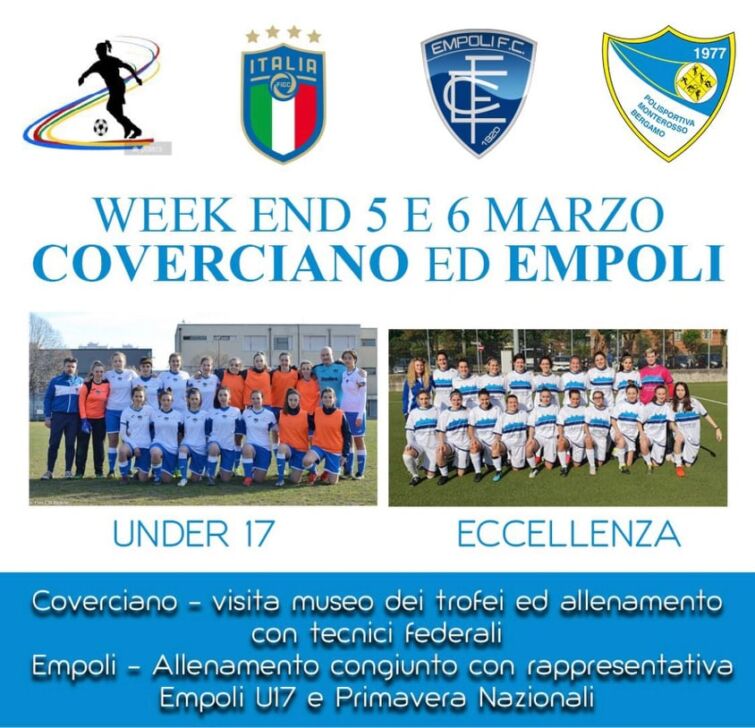 Week-end tutto da vivere per le ragazze del Monterosso Femminile. La prima squadra di mister Paolo Confalonieri e l’Under 17 partiranno infatti sabato mattina alla volta della Toscana. A Coverciano visiteranno il museo dei trofei e svolgeranno un allenamento con i tecnici federali. A Empoli invece si svolgerà un allenamento congiunto con l’Under 17 e la Primavera di casa.